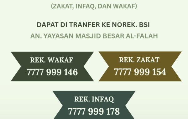 InsyaAllah Yayasan Masjid Besar Al-Falah akan menerima dan menyalurkan Zakat, Infaq, Shodaqoh, Wakaf Bapak/Ibu jama’ah Masjid Al-Falah.