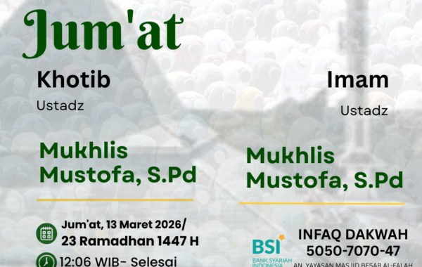 Untuk mendukung Kegiatan Dakwah Masjid Al-Falah dapat memberikan infaq terbaik ke Norek. BSI: 5050-7070-47 an. Yayasan Masjid Besar Al-Falah