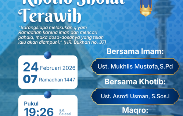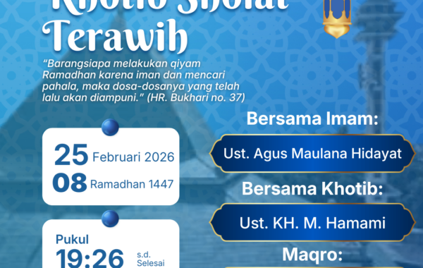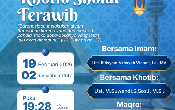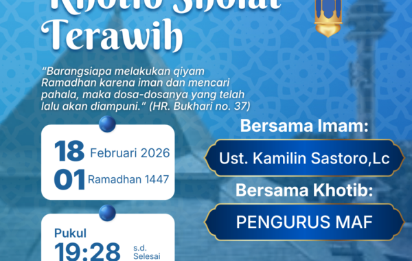 Assalamualaikum warahmatullahi wabarakatuh. Jama’ah Masjid Al-Falah kami mengundang jama’ah untuk beribadah sholat terawih di Masjid Al-Falah.