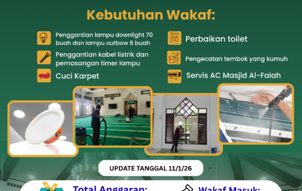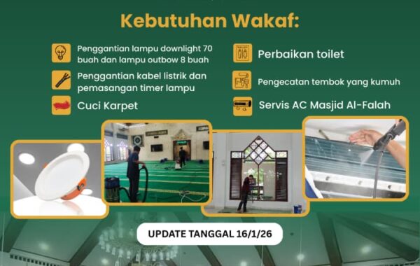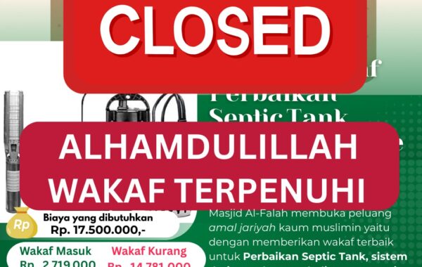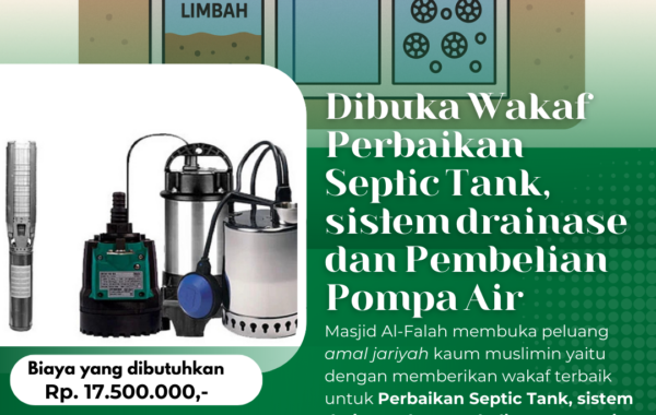 Jama’ah Masjid Al-Falah kami membuka peluang amal jariyah yaitu dengan memberikan wakaf terbaik untuk Perbaikan Septic Tank, sistem drainase dan Pembelian Pompa Air.
